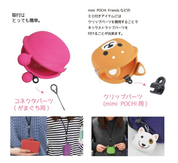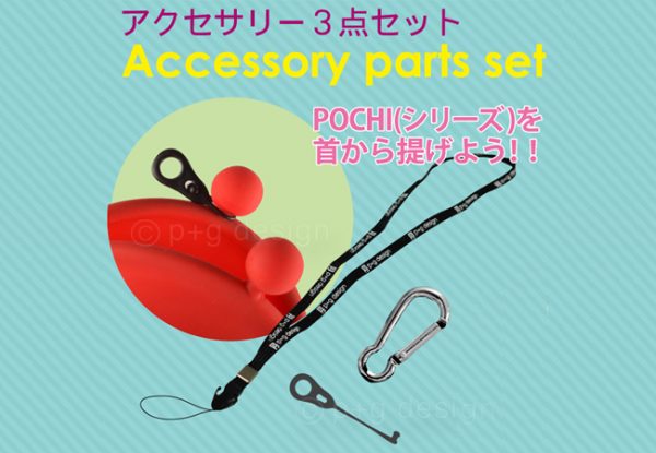 Set za pripenjanje silikonskih torbic POCHI je sestavljen iz: 1x karabin, 1x vrvica za okoli vratu in 2x pvc sponke.